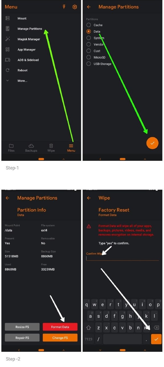 2) Wipe> Dalvik, Cache, Data, System, Vendor